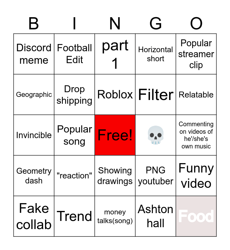 This bingo card has a free space and 24 words: Fake collab, "reaction", Roblox, Ashton hall, Popular streamer clip, Discord meme, Football Edit, part 1, 💀, Commenting on videos of he'/she's own music, Invincible, Drop shipping, PNG youtuber, Funny video, Geographic, Trend, money talks(song), Horizontal short, Relatable, Geometry dash, Popular song, Showing drawings, Filter and Food.