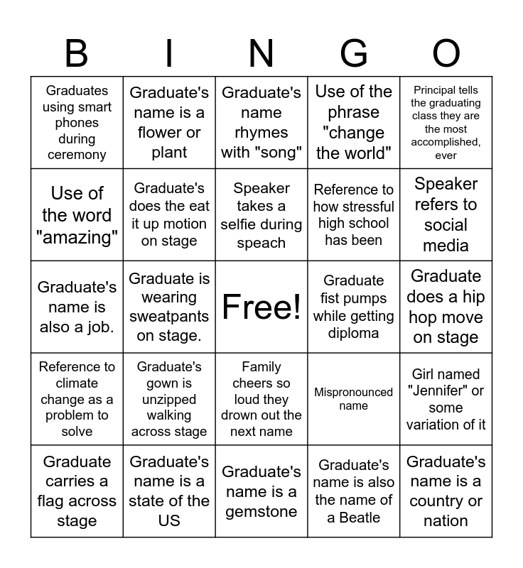 This bingo card has a free space and 24 words: Graduate's gown is unzipped walking across stage, Graduate's name is a state of the US, Speaker takes a selfie during speach, Graduate carries a flag across stage, Principal tells the graduating class they are the most accomplished, ever, Graduates using smart phones during ceremony, Use of the word "amazing", Graduate's name is a flower or plant, Graduate fist pumps while getting diploma, Family cheers so loud they drown out the next name, Reference to how stressful high school has been, Graduate's name is also a job., Mispronounced name, Girl named "Jennifer" or some variation of it, Graduate's does the eat it up motion on stage, Graduate's name is also the name of a Beatle, Graduate does a hip hop move on stage, Graduate's name rhymes with "song", Speaker refers to social media, Graduate is wearing sweatpants on stage., Graduate's name is a country or nation, Reference to climate change as a problem to solve, Use of the phrase "change the world" and Graduate's name is a gemstone.
