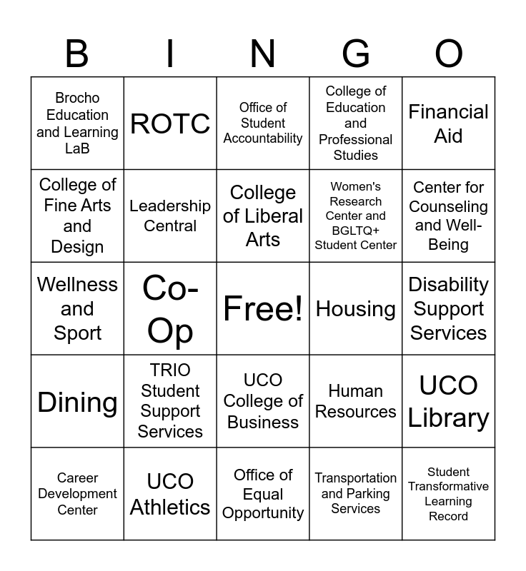 This bingo card has a free space and 35 words: Community Engagement, Office of Student Engagement, Fraternity & Sorority Life, Leadership Central, UCO College of Business, College of Education and Professional Studies, College of Fine Arts and Design, Forensic Science Institute, College of Liberal Arts, College of Math and Science, Wellness and Sport, Financial Aid, Student Advocacy, Scholarship Office, Brocho Education and Learning LaB, Housing, Transportation and Parking Services, Co-Op, Dining, Student Transformative Learning Record, Human Resources, Career Development Center, UCO Library, UCO Athletics, Office of Student Accountability, Center for Counseling and Well-Being, Bookstore, Centre for Global Competency, Women's Research Center and BGLTQ+ Student Center, Disability Support Services, Veteran Student Services, Office of Equal Opportunity, TRIO Student Support Services, ROTC and Chickasaw Nation.