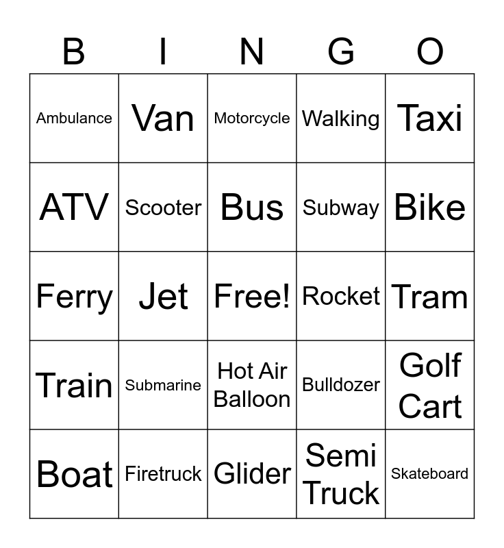 This bingo card has a free space and 33 words: Car, Horse, Jet, Plane, Train, Scooter, Taxi, Boat, Van, Sled, Bus, Motorcycle, Ship, Helicopter, Rocket, Bike, Firetruck, Ferry, Submarine, Bulldozer, Hot Air Balloon, Truck, Ambulance, Tram, Glider, Skateboard, Walking, Subway, ATV, Golf Cart, Tractor, Semi Truck and RV.