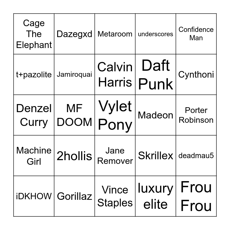 This bingo card has a free space and 24 words: 2hollis, Gorillaz, Calvin Harris, iDKHOW, Confidence Man, Cage The Elephant, t+pazolite, Dazegxd, Madeon, Jane Remover, Daft Punk, Denzel Curry, Skrillex, deadmau5, Jamiroquai, luxury elite, Porter Robinson, Metaroom, Cynthoni, MF DOOM, Frou Frou, Machine Girl, underscores and Vince Staples.