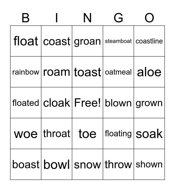 This bingo card has a free space and 29 words: boast, boat, cloak, croak, float, groan, roam, throat, blown, bowl, grown, shown, snow, throw, aloe, doe, toe, woe, coastline, floated, floating, lifeboat, oatmeal, rainbow, steamboat, coast, soak, toast and oat.