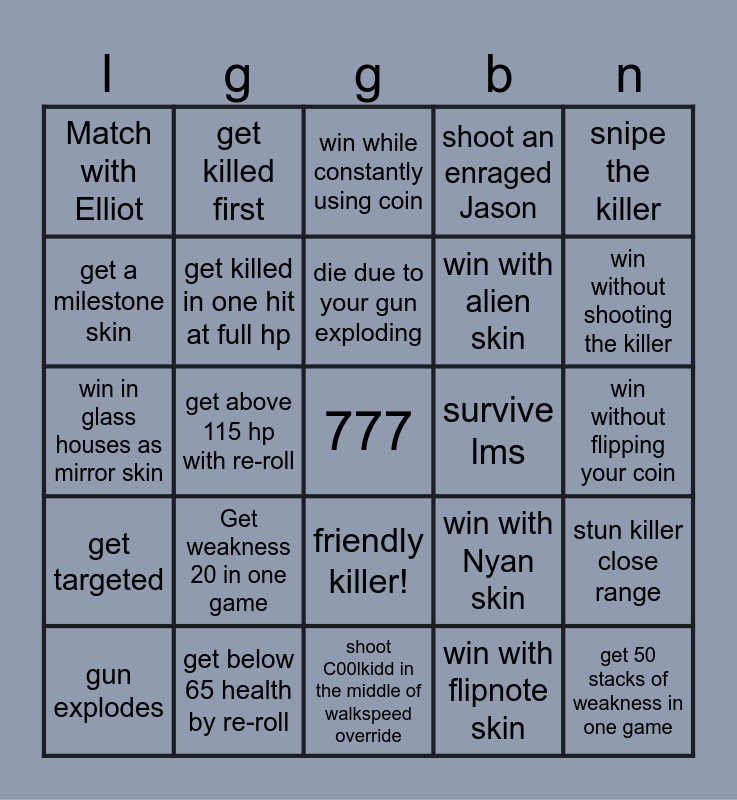 This bingo card has a free space and 24 words: Get weakness 20 in one game, get below 65 health by re-roll, die due to your gun exploding, gun explodes, snipe the killer, Match with Elliot, get a milestone skin, get killed first, survive lms, friendly killer!, win with alien skin, win in glass houses as mirror skin, win with Nyan skin, stun killer close range, get killed in one hit at full hp, win with flipnote skin, win without flipping your coin, win while constantly using coin, win without shooting the killer, get above 115 hp with re-roll, get 50 stacks of weakness in one game, get targeted, shoot an enraged Jason and shoot C00lkidd in the middle of walkspeed override.