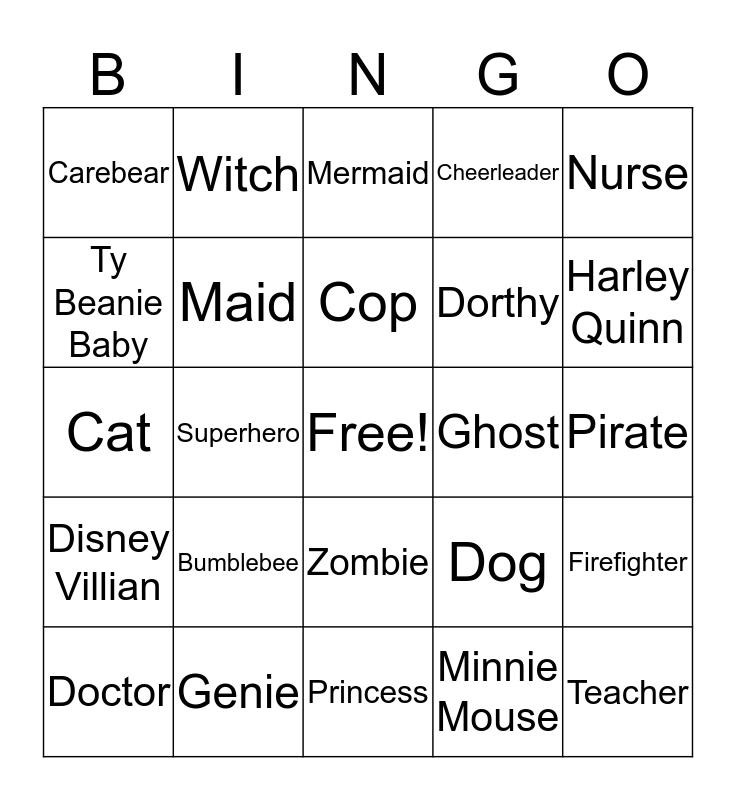 This bingo card has a free space and 25 words: Bumblebee, Princess, Cop, Doctor, Nurse, Carebear, Ty Beanie Baby, Witch, Ghost, Zombie, Dorthy, Cat, Dog, Firefighter, Maid, Schoolgirl, Pirate, Mermaid, Harley Quinn, Superhero, Teacher, Genie, Disney Villian, Cheerleader and Minnie Mouse.