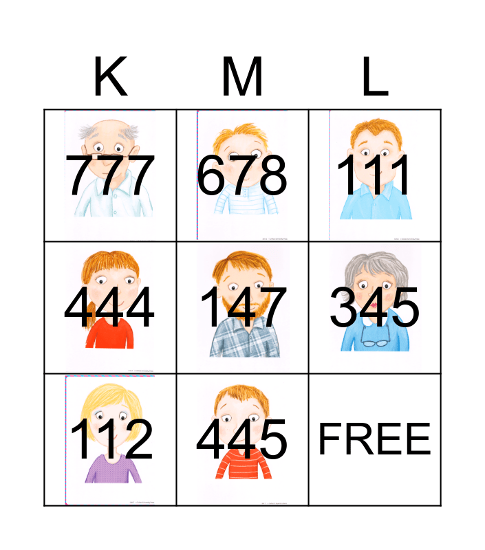 This bingo card has 8 images and 9 words: 112, 111, 678, 444, 777, 345, 147, FREE and 445.
