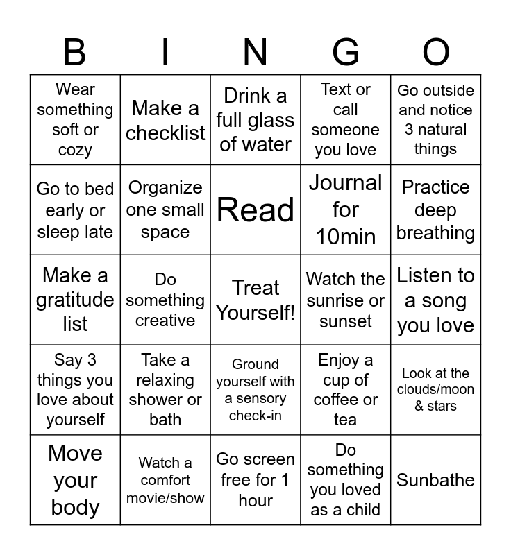 This bingo card has a free space and 24 words: Take a relaxing shower or bath, Watch a comfort movie/show, Read, Move your body, Go outside and notice 3 natural things, Wear something soft or cozy, Go to bed early or sleep late, Make a checklist, Watch the sunrise or sunset, Ground yourself with a sensory check-in, Journal for 10min, Make a gratitude list, Enjoy a cup of coffee or tea, Look at the clouds/moon & stars, Organize one small space, Do something you loved as a child, Listen to a song you love, Drink a full glass of water, Practice deep breathing, Do something creative, Sunbathe, Say 3 things you love about yourself, Text or call someone you love and Go screen free for 1 hour.