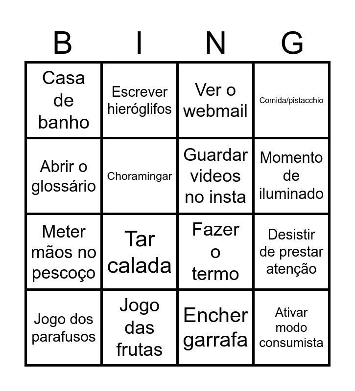 This bingo card has 16 words: Jogo dos parafusos, Jogo das frutas, Ver o webmail, Comida/pistacchio, Abrir o glossário, Escrever hieróglifos, Fazer o termo, Desistir de prestar atenção, Casa de banho, Choramingar, Encher garrafa, Momento de iluminado, Meter mãos no pescoço, Tar calada, Guardar videos no insta and Ativar modo consumista.