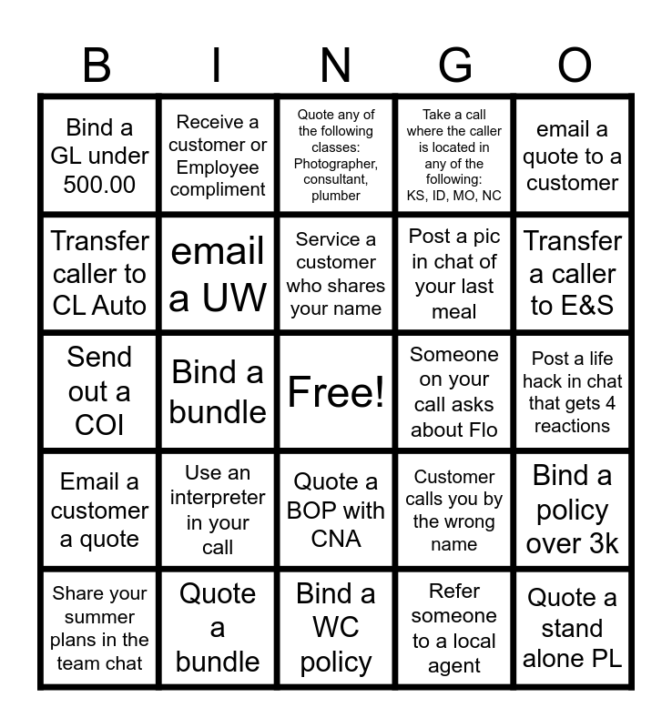 This bingo card has a free space and 24 words: Use an interpreter in your call, Quote a bundle, Service a customer who shares your name, Share your summer plans in the team chat, email a quote to a customer, Bind a GL under 500.00, Transfer caller to CL Auto, Receive a customer or Employee compliment, Someone on your call asks about Flo, Quote a BOP with CNA, Post a pic in chat of your last meal, Send out a COI, Customer calls you by the wrong name, Bind a policy over 3k, email a UW, Refer someone to a local agent, Post a life hack in chat that gets 4 reactions, Quote any of the following classes: Photographer, consultant, plumber, Transfer a caller to E&S, Bind a bundle, Quote a stand alone PL, Email a customer a quote, Take a call where the caller is located in any of the following: KS, ID, MO, NC and Bind a WC policy.