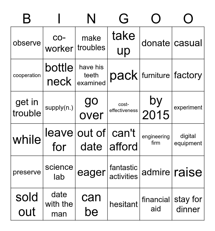 This bingo card has 36 words: fantastic activities, eager, hesitant, cooperation, while, cost-effectiveness, bottle neck, can be, donate, admire, factory, take up, raise, supply(n.), pack, observe, preserve, by 2015, get in trouble, make troubles, go over, leave for, can't afford, out of date, engineering firm, co-worker, furniture, date with the man, have his teeth examined, casual, stay for dinner, sold out, digital equipment, experiment, science lab and financial aid.