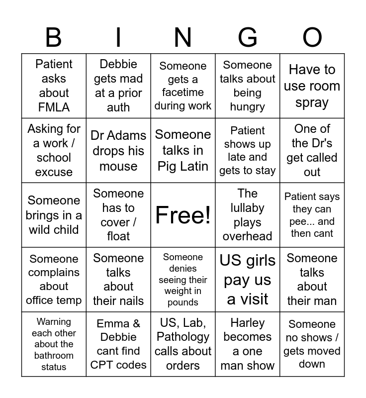 This bingo card has a free space and 24 words: Someone talks about their nails, Emma & Debbie cant find CPT codes, Someone talks in Pig Latin, Warning each other about the bathroom status, Have to use room spray, Patient asks about FMLA, Asking for a work / school excuse, Debbie gets mad at a prior auth, The lullaby plays overhead, Someone denies seeing their weight in pounds, Patient shows up late and gets to stay, Someone brings in a wild child, US girls pay us a visit, Someone talks about their man, Dr Adams drops his mouse, Harley becomes a one man show, Patient says they can pee... and then cant, Someone gets a facetime during work, One of the Dr's get called out, Someone has to cover / float, Someone no shows / gets moved down, Someone complains about office temp, Someone talks about being hungry and US, Lab, Pathology calls about orders.