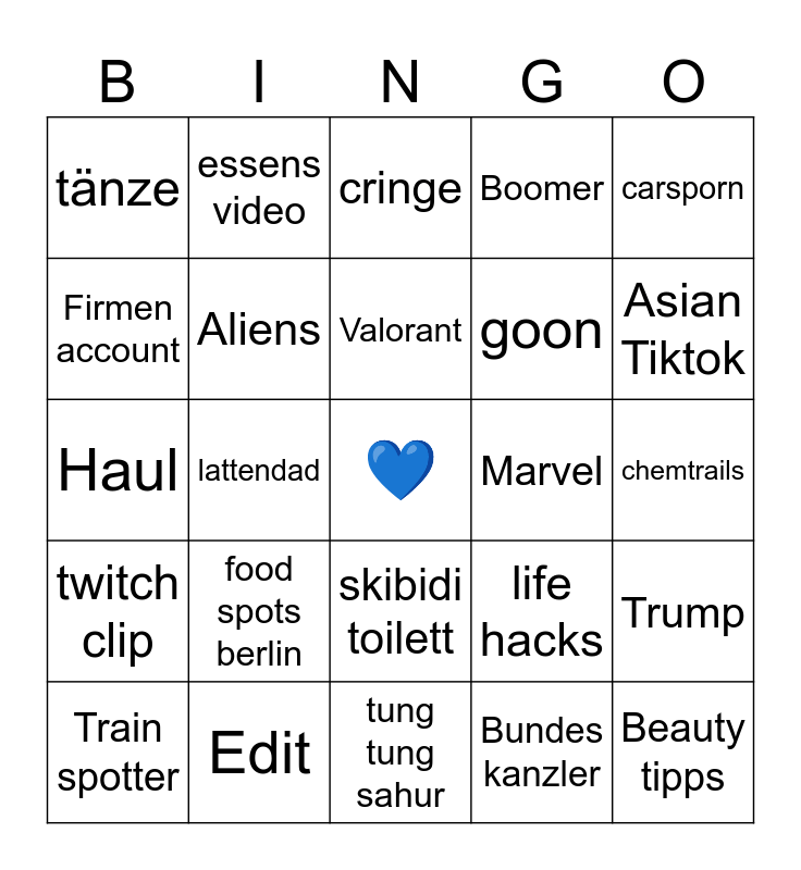 This bingo card has a free space and 24 words: food spots berlin, Edit, Valorant, Train spotter, carsporn, tänze, Firmen account, essens video, Marvel, skibidi toilett, goon, Haul, life hacks, Trump, Aliens, Bundes kanzler, chemtrails, cringe, Asian Tiktok, lattendad, Beauty tipps, twitch clip, Boomer and tung tung sahur.