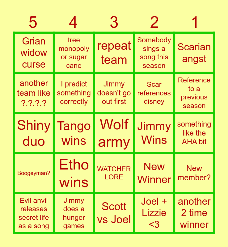 This bingo card has 25 words: Etho wins, Scott vs Joel, Jimmy doesn't go out first, Evil anvil releases secret life as a song, Scarian angst, Grian widow curse, another team like ?.?.?.?, tree monopoly or sugar cane, Jimmy Wins, WATCHER LORE, Scar references disney, Shiny duo, New Winner, New member?, I predict something correctly, another 2 time winner, something like the AHA bit, repeat team, Reference to a previous season, Tango wins, Wolf army, Jimmy does a hunger games, Boogeyman?, Somebody sings a song this season and Joel + Lizzie <3.