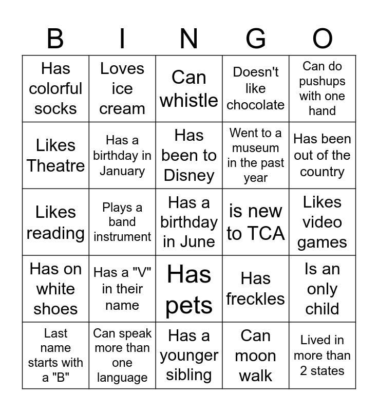 This bingo card has a free space and 29 words: Last name starts with a "B", Was born in Illinois, Plays a band instrument, Plays soccer, Has colorful socks, Can whistle, Has a birthday in January, Has a "V" in their name, is new to TCA, Can speak more than one language, Likes video games, Lived in more than 2 states, Has a younger sibling, Can moon walk, Has been out of the country, Likes art, Has pets, Has on white shoes, Can do pushups with one hand, Likes reading, Has freckles, Has an older sibling, Went to a museum in the past year, Likes Theatre, Doesn't like chocolate, Loves ice cream, Is an only child, Has been to Disney and Likes to watch TV.