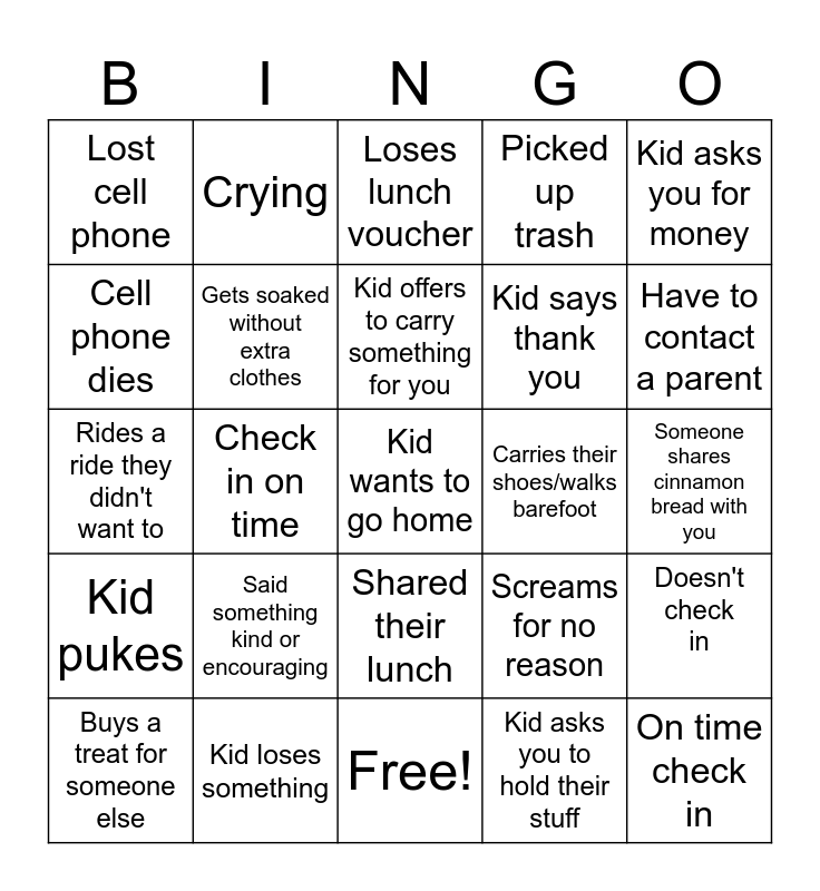 This bingo card has 25 words: Kid pukes, Kid loses something, Kid wants to go home, Kid asks you to hold their stuff, Kid asks you for money, Lost cell phone, Crying, Loses lunch voucher, Carries their shoes/walks barefoot, Doesn't check in, Cell phone dies, Gets soaked without extra clothes, Free!, Screams for no reason, Have to contact a parent, Buys a treat for someone else, Check in on time, Kid offers to carry something for you, Kid says thank you, Someone shares cinnamon bread with you, Rides a ride they didn't want to, Said something kind or encouraging, Shared their lunch, Picked up trash and On time check in.