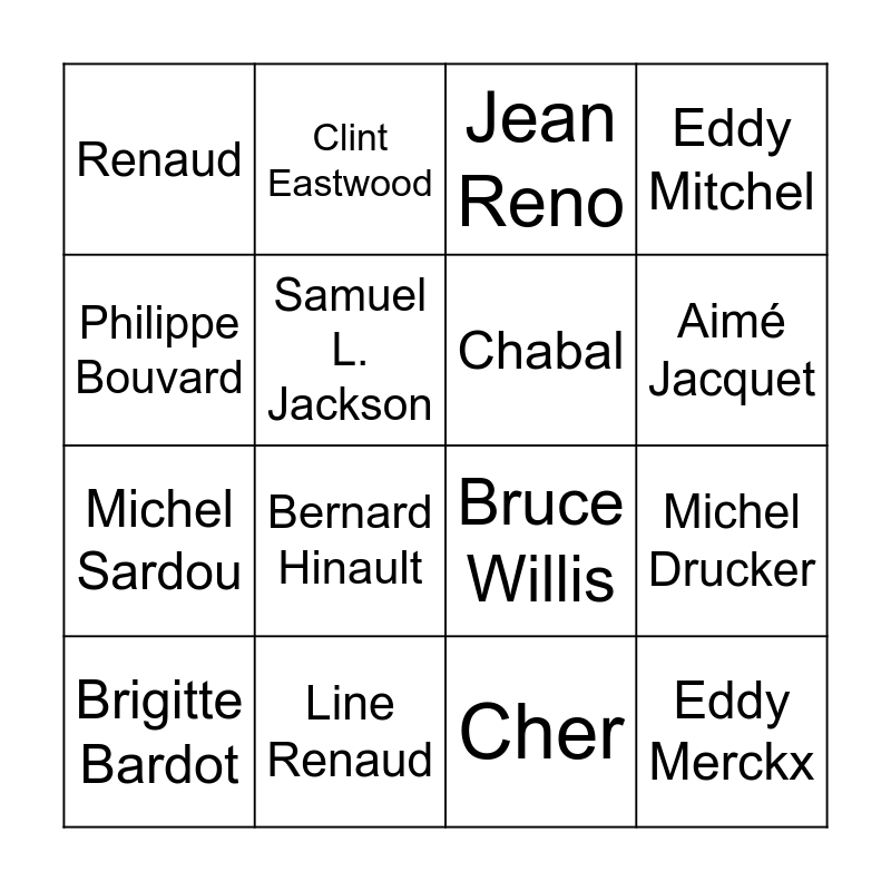 This bingo card has 16 words: Line Renaud, Michel Drucker, Jean Reno, Renaud, Michel Sardou, Clint Eastwood, Bruce Willis, Cher, Philippe Bouvard, Samuel L. Jackson, Brigitte Bardot, Eddy Mitchel, Bernard Hinault, Aimé Jacquet, Chabal and Eddy Merckx.