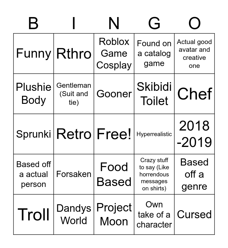 This bingo card has a free space and 24 words: Forsaken, Dandys World, Gooner, Troll, Actual good avatar and creative one, Funny, Plushie Body, Rthro, Hyperrealistic, Food Based, Skibidi Toilet, Sprunki, Crazy stuff to say (Like horrendous messages on shirts), Based off a genre, Gentleman (Suit and tie), Own take of a character, 2018 -2019, Roblox Game Cosplay, Chef, Retro, Cursed, Based off a actual person, Found on a catalog game and Project Moon.
