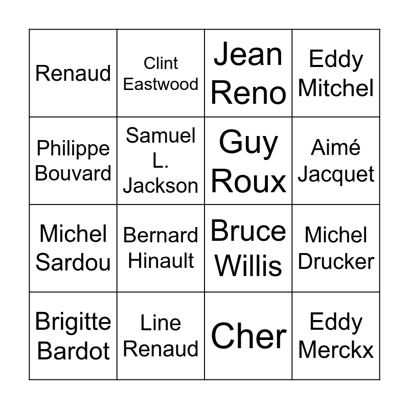 This bingo card has 16 words: Line Renaud, Michel Drucker, Jean Reno, Renaud, Michel Sardou, Clint Eastwood, Bruce Willis, Cher, Philippe Bouvard, Samuel L. Jackson, Brigitte Bardot, Eddy Mitchel, Bernard Hinault, Aimé Jacquet, Guy Roux and Eddy Merckx.