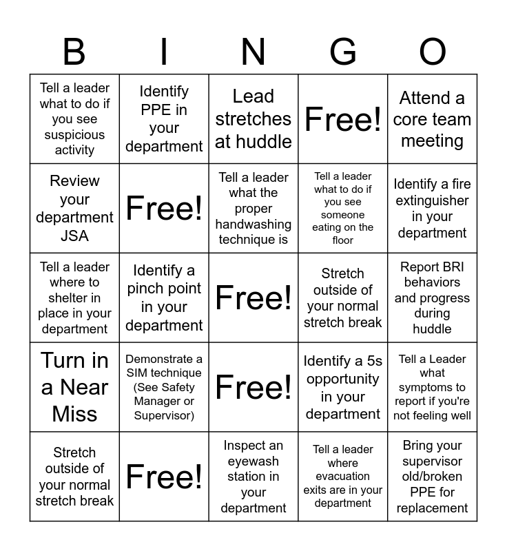 This bingo card has a free space and 24 words: Demonstrate a SIM technique (See Safety Manager or Supervisor), Free!, Tell a leader what the proper handwashing technique is, Stretch outside of your normal stretch break, Attend a core team meeting, Tell a leader what to do if you see suspicious activity, Review your department JSA, Identify PPE in your department, Stretch outside of your normal stretch break, Free!, Tell a leader what to do if you see someone eating on the floor, Tell a leader where to shelter in place in your department, Identify a 5s opportunity in your department, Tell a Leader what symptoms to report if you're not feeling well, Free!, Tell a leader where evacuation exits are in your department, Report BRI behaviors and progress during huddle, Lead stretches at huddle, Identify a fire extinguisher in your department, Identify a pinch point in your department, Bring your supervisor old/broken PPE for replacement, Turn in a Near Miss, Free! and Inspect an eyewash station in your department.