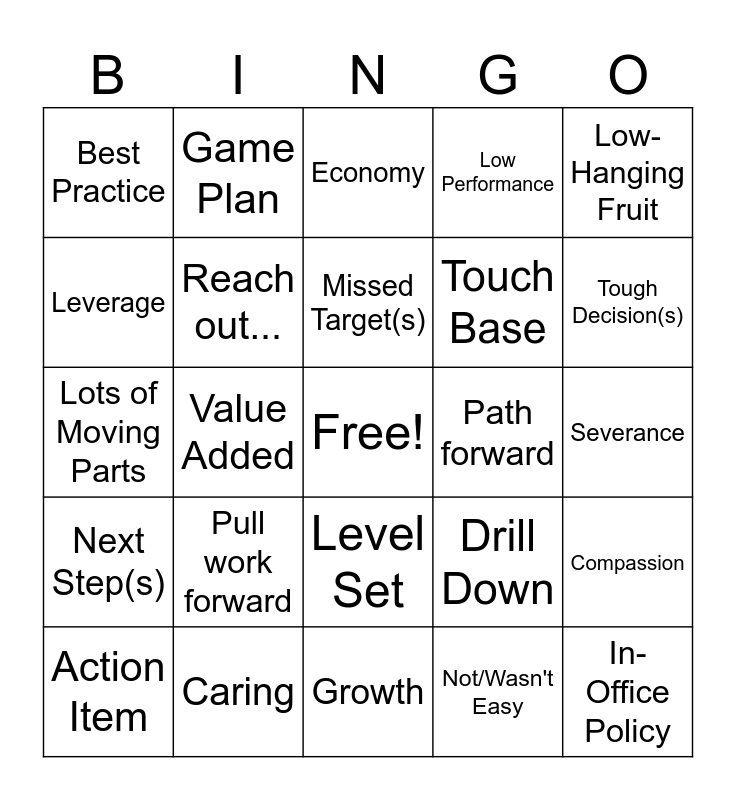 This bingo card has a free space and 24 words: Pull work forward, Caring, Missed Target(s), Action Item, Low-Hanging Fruit, Best Practice, Leverage, Game Plan, Path forward, Level Set, Touch Base, Lots of Moving Parts, Drill Down, Compassion, Reach out..., Not/Wasn't Easy, Severance, Economy, Tough Decision(s), Value Added, In-Office Policy, Next Step(s), Low Performance and Growth.