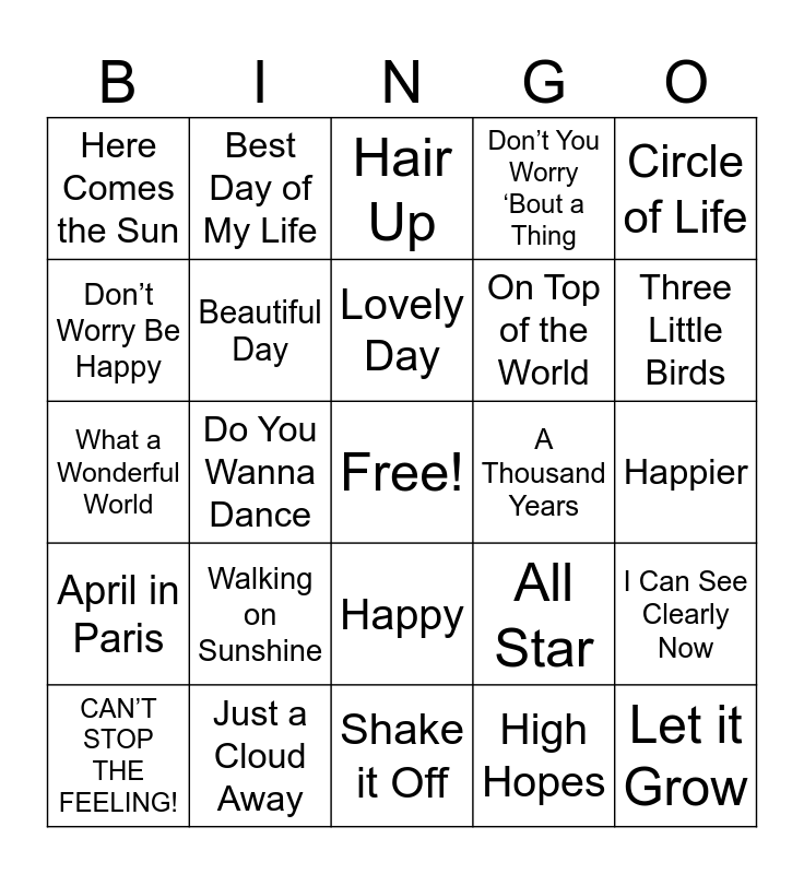 This bingo card has a free space and 24 words: Walking on Sunshine, Just a Cloud Away, Lovely Day, CAN’T STOP THE FEELING!, Circle of Life, Here Comes the Sun, Don’t Worry Be Happy, Best Day of My Life, A Thousand Years, Happy, On Top of the World, What a Wonderful World, All Star, I Can See Clearly Now, Beautiful Day, High Hopes, Happier, Hair Up, Three Little Birds, Do You Wanna Dance, Let it Grow, April in Paris, Don’t You Worry ‘Bout a Thing and Shake it Off.