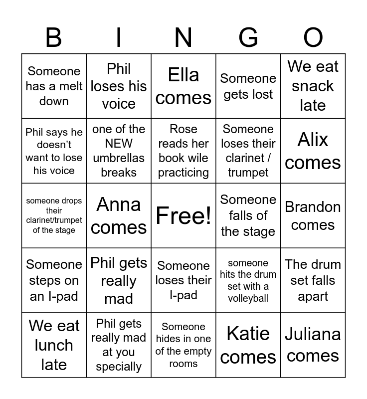 This bingo card has a free space and 24 words: Phil gets really mad, Phil gets really mad at you specially, Rose reads her book wile practicing, We eat lunch late, We eat snack late, Someone has a melt down, Phil says he doesn’t want to lose his voice, Phil loses his voice, Someone falls of the stage, Someone loses their I-pad, Someone loses their clarinet / trumpet, someone drops their clarinet/trumpet of the stage, someone hits the drum set with a volleyball, The drum set falls apart, one of the NEW umbrellas breaks, Katie comes, Brandon comes, Ella comes, Alix comes, Anna comes, Juliana comes, Someone steps on an I-pad, Someone gets lost and Someone hides in one of the empty rooms.