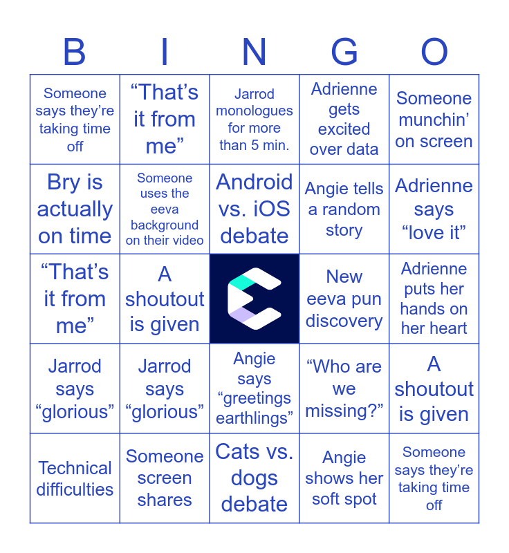 This bingo card has a free space and 73 words: Angie and Jarrod poke at each other, “You’re on mute”, Someone says they’re taking time off, Someone is more than 5 minutes late, Angie shows her soft spot, Someone outside of the agenda shares updates, Jarrod says “glorious”, “I’ll make this quick”, “Who are we missing?”, “___ won’t be here today”, Angie tells a random story, Jarrod monologues for more than 5 min., Someone uses the eeva background on their video, Adrienne puts her hands on her heart, At least 5 cameras off, “That’s it from me”, Cats vs. dogs debate, Bry is actually on time, We go off track for more than 2 mins., New eeva pun discovery, Android vs. iOS debate, Adrienne gets excited over data, Someone munchin’ on screen, Angie says “greetings earthlings”, Technical difficulties, Someone triggers a Google Meet effect, Surprise pet appearance!, Adrienne says “beautiful”, Big announcement from the bosses, Adrienne says “love it”, Someone screen shares, “Can you hear me?”, Angie says “nerds”, Someone comments on the weather, A shoutout is given, Jarrod says “I won’t ramble”, Angie and Jarrod poke at each other, “You’re on mute”, Someone says they’re taking time off, Someone is more than 5 minutes late, Angie shows her soft spot, Jarrod says “glorious”, “I’ll make this quick”, “Who are we missing?”, “___ won’t be here today”, Angie tells a random story, Jarrod monologues for more than 5 min., Someone uses the eeva background on their video, Adrienne puts her hands on her heart, “That’s it from me”, Cats vs. dogs debate, Bry is actually on time, We go off track for more than 2 mins., New eeva pun discovery, Android vs. iOS debate, Adrienne gets excited over data, Someone munchin’ on screen, Angie says “greetings earthlings”, Technical difficulties, Someone uses a Google Meet effect, Surprise pet appearance!, Adrienne says “beautiful”, Big announcement from the bosses, Adrienne says “love it”, Someone screen shares, “Can you hear me?”, Angie says “nerds”, Someone comments on the weather, A shoutout is given, Scott fires Jon, At least 3 devs have cameras off, Someone forgets to popcorn to someone else and Someone has to leave early.