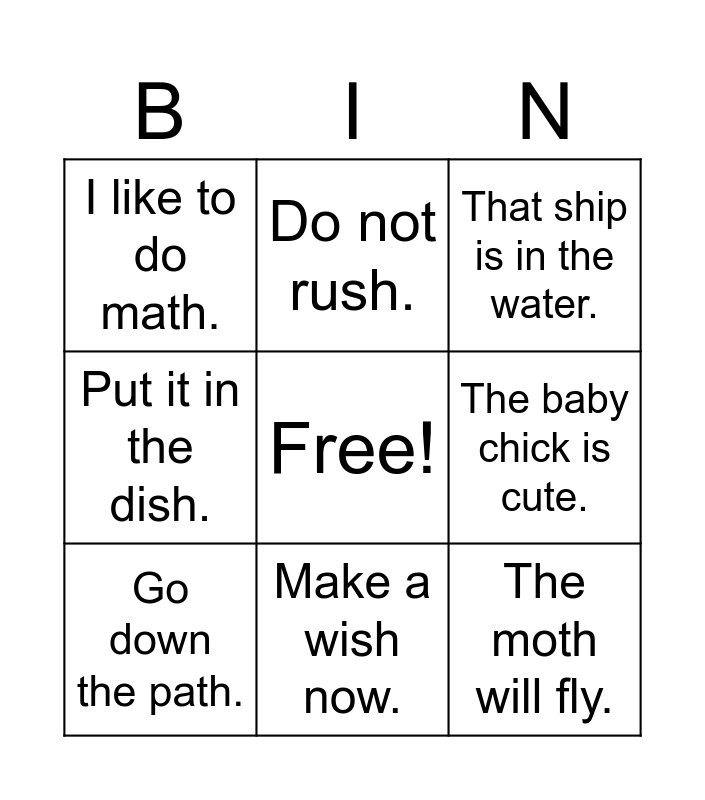 This bingo card has a free space and 14 words: The fish swims fast, Did you take a bath?, Go down the path., Do not rush., Put it in the dish., The moth will fly., Free!, Chop the food., Make a wish now., I like to do math., I need some cash., The baby chick is cute., That ship is in the water. and I have a rash on my chin..
