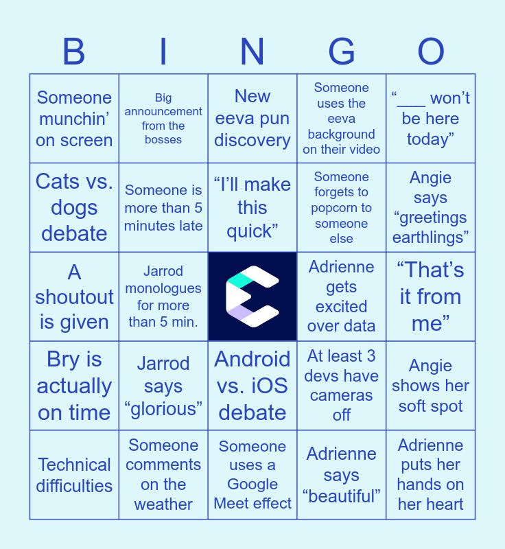 This bingo card has a free space and 37 words: Angie and Jarrod poke at each other, “You’re on mute”, Someone says they’re taking time off, Someone is more than 5 minutes late, Angie shows her soft spot, Jarrod says “glorious”, “I’ll make this quick”, “Who are we missing?”, “___ won’t be here today”, Angie tells a random story, Jarrod monologues for more than 5 min., Someone uses the eeva background on their video, Adrienne puts her hands on her heart, “That’s it from me”, Cats vs. dogs debate, Bry is actually on time, We go off track for more than 2 mins., New eeva pun discovery, Android vs. iOS debate, Adrienne gets excited over data, Someone munchin’ on screen, Angie says “greetings earthlings”, Technical difficulties, Someone uses a Google Meet effect, Surprise pet appearance!, Adrienne says “beautiful”, Big announcement from the bosses, Adrienne says “love it”, Someone screen shares, “Can you hear me?”, Angie says “nerds”, Someone comments on the weather, A shoutout is given, Scott fires Jon, At least 3 devs have cameras off, Someone forgets to popcorn to someone else and Someone has to leave early.