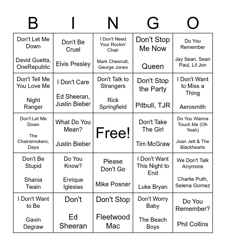 This bingo card has a free space and 71 words: Do It Again Steely Dan, Don't Be Cruel Elvis Presley, Don't Speak No Doubt, Don't Stop Believin' Journey, Don't Stop Fleetwood Mac, Don't Stop 'Til You Get Enough Michael Jackson, Don't Stop Me Now Queen, Don't Stop The Music Rihanna, Don't Stop the Party Pitbull, TJR, Don't Do Me Like That Tom Petty and the Heartbreakers, I Don't Want to Be Gavin Degraw, I Don't Wanna Wait David Guetta, OneRepublic, I Don't Want to Miss a Thing Aerosmith, Don't Let Me Down David Guetta, OneRepublic, I Don't Want to Miss a Thing Aerosmith, Don't Let Me Down The Chainsmokers, Daya, I Don't Want This Night to End Luke Bryan, Do You Remember Jay Sean, Sean Paul, Lil Jon, Do You Believe In Love Huey Lewis & The News, Do You Wanna Touch Me (Oh Yeah) Joan Jett & The Blackhearts, Do You Know? Enrique Iglesias, Do You Remember? Phil Collins, We Don't Talk Anymore Charlie Puth, Selena Gomez, We Don't Have To Take Our Clothes Off Jermaine Stewart, We Don't Need Another Hero Tina Turner, You Don't Know How It Feels Tom Petty, Why Don't You & I Santana, Chad Kroeger, Why Don't We Just Dance Josh Turner, Don't Worry Be Happy Bobby McFerrin, Don't You Want Me The Human League, Don't Ed Sheeran, Don't Wake Me Up Chris Brown, Don't Go Breaking My Heart Elton John, Kiki Dee, Why Don't We Get Drunk Jimmy Buffett, Don't Worry Baby The Beach Boys, Don't Get Me Wrong Pretenders, Don't Bring Me Down ELO, Don't Blink Kenny Chesney, Don't Tell Me You Love Me Night Ranger, Don't Go Away Mad Motley Crue, Please Don't Go Mike Posner, Don't Go Skrillex, Justin Bieber, Don't Be Stupid Shania Twain, That Don't Impress Me Much Shania Twain, Don't Say You Love Me Billy Squier, Don't Say Goodnight Hot Chelle Rae, I Don't Mind Usher, Juicy J, I Don't Care Ed Sheeran, Justin Bieber, This Is How We Do It Montell Jordan, This Is How We Do Katy Perry, I Don't Like It, I Love It Flo Rida, Please Don't Go Girl New Kids On The Block, Don't Take The Girl Tim McGraw, Don't Cry Guns N' Roses, Big Girls Don't Cry Fergie, Please Don't Leave Me P!nk, Don't Talk to Strangers Rick Springfield, Don't Stand So Close To Me The Police, Don't You (Forget About Me) Simple Minds, Don't Wanna Know Maroon 5, Don't Cha The Pussycat Dolls, Don't Close Your Eyes Kix, What Do You Mean? Justin Bieber, Hips Don't Lie Shakira, Wyclef Jean, Don't Smile Sabrina Carpenter, (Don't Fear) The Reaper Blue Oyster Cult, I Don't Need Your Rockin' Chair Mark Chesnutt, George Jones, Don't Rock the Jukebox Alan Jackson, She Don't Know She's Beautiful Sammy Kershaw, Mammas, Don't Let Your Babies Grow Up to Be Cowboys Waylon Jennings and I'm in a Hurry (And Don't Know Why) Alabama.