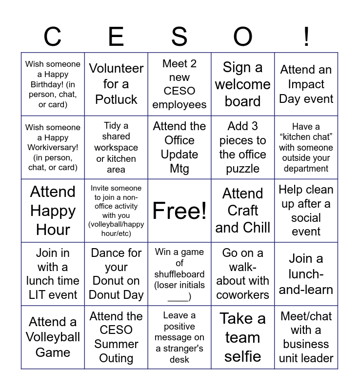 This bingo card has a free space and 24 words: Dance for your Donut on Donut Day, Attend the CESO Summer Outing, Attend the Office Update Mtg, Attend a Volleyball Game, Attend an Impact Day event, Wish someone a Happy Birthday! (in person, chat, or card), Wish someone a Happy Workiversary! (in person, chat, or card), Volunteer for a Potluck, Attend Craft and Chill, Win a game of shuffleboard (loser initials ____), Add 3 pieces to the office puzzle, Attend Happy Hour, Go on a walk-about with coworkers, Join a lunch-and-learn, Tidy a shared workspace or kitchen area, Take a team selfie, Help clean up after a social event, Meet 2 new CESO employees, Have a “kitchen chat” with someone outside your department, Invite someone to join a non-office activity with you (volleyball/happy hour/etc), Meet/chat with a business unit leader, Join in with a lunch time LIT event, Sign a welcome board and Leave a positive message on a stranger's desk.