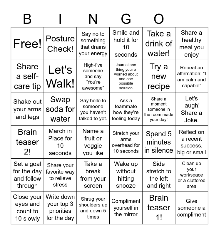This bingo card has 66 words: Give a compliment!, Side stretch to the left and right, Take 3 Deep Breaths, March in Place for 10 seconds, Share your favorite way to relieve stress, Share something you're grateful for!, Posture Check!, Share a Wellness Tip to your Neighbor, Let's Walk!, Sit quietly for 15 seconds, Let's laugh! Share a Joke., Shoulder Rolls!, Say hello to someone you haven’t talked to yet., Take a drink of water!, Stand up and sit back down 5 times, Share a healthy meal you enjoy, Repeat an affirmation: “I am calm and capable”, Free!, Stretch your neck side to side, High-five someone and say “You’re awesome”, Share a moment someone in the room made your day!, Ask a teammate how they’re feeling today, Smile and hold it for 10 seconds, Close your eyes and count to 10 slowly, Show your best “power pose”, Brain teaser 1!, Shrug your shoulders up and down 5 times, Give yourself a compliment, Shake out your arms and legs, Share a stress relief tip out loud, Name a fruit or veggie you like, Deskercise!, Share your favorite positive affimration, Share a new healthy recipe!, Brain teaser 2!, Stretch your arms overhead for 10 seconds, Journal a thought or feeling, Try a new recipe, Reflect on a recent success, big or small, Give someone a compliment, Share a self-care tip, Take a break from your screen, Swap soda for water, Take a walk after lunch, March in place for 1 minute, Write down your top 3 priorities for the day, Journal one thing you're worried about and one possible solution, Try a new form of movement (biking, Pilates, etc.), Set a goal for the day and follow through, Wake up without hitting snooze, Make your bed in the morning, Eat mindfully, Go one day without complaining, Watch a sunrise or sunset, Try a breathing app or guided breath work, Clean up your workspace or a cluttered area, Turn your phone on “Do Not Disturb” for 1 hour, Read something non-work related for 10 minutes, Say no to something that drains your energy, Spend 5 minutes in silence, Compliment yourself in the mirror, Send a positive message to someone, Do one small thing you've been procrastinating, Write a quick thank-you message to someone, Choose a positive mantra for the day and Plan something to look forward to this week.