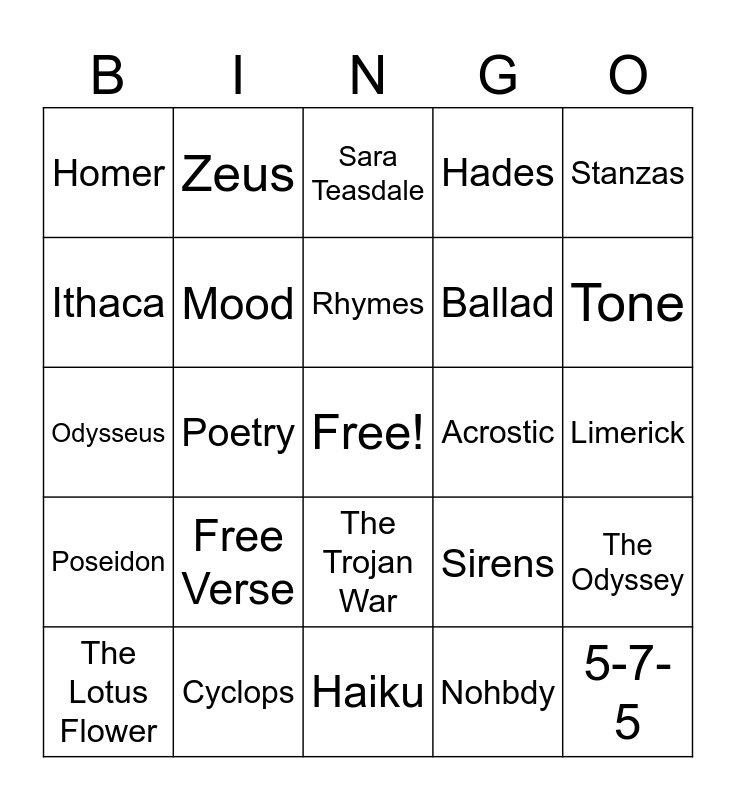 This bingo card has a free space and 24 words: Free Verse, Cyclops, Rhymes, The Lotus Flower, Stanzas, Homer, Ithaca, Zeus, Acrostic, The Trojan War, Ballad, Odysseus, Sirens, The Odyssey, Mood, Nohbdy, Limerick, Sara Teasdale, Tone, Poetry, 5-7-5, Poseidon, Hades and Haiku.