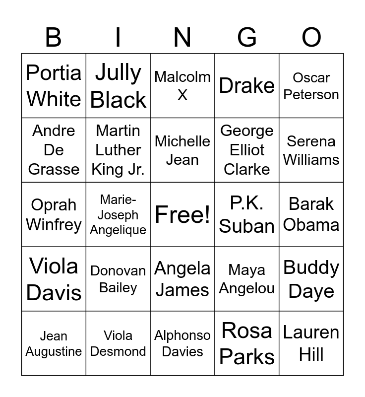 This bingo card has a free space and 24 words: Donovan Bailey, Viola Desmond, Michelle Jean, Jean Augustine, Oscar Peterson, Portia White, Andre De Grasse, Jully Black, P.K. Suban, Angela James, George Elliot Clarke, Oprah Winfrey, Maya Angelou, Buddy Daye, Martin Luther King Jr., Rosa Parks, Barak Obama, Malcolm X, Serena Williams, Marie- Joseph Angelique, Lauren Hill, Viola Davis, Drake and Alphonso Davies.