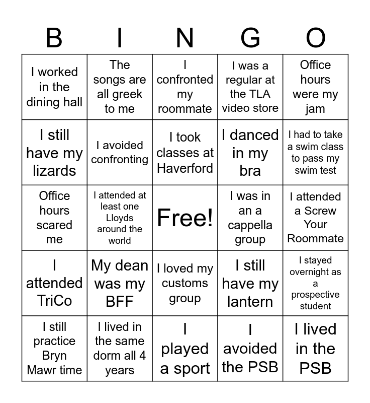 This bingo card has a free space and 30 words: I lived in the same dorm all 4 years, I lived in a different dorm each year, I attended at least one Lloyds around the world, I wrote napkin notes all the time, I worked in the dining hall, I confronted my roommate, I avoided confronting, I loved my customs group, I was in an a cappella group, I played a sport, I attended a Screw Your Roommate, I lived in the PSB, I avoided the PSB, I passed my swim test freshman year, I had to take a swim class to pass my swim test, I went to Philly all the time, I still have my lantern, I attended TriCo, My dean was my BFF, Office hours were my jam, Office hours scared me, I can still sing all the Lantern Night songs, The songs are all greek to me, I danced in my bra, I still have my lizards, I was a regular at the TLA video store, I stayed overnight as a prospective student, I still practice Bryn Mawr time, I took classes at Haverford and I took classes at Swat.