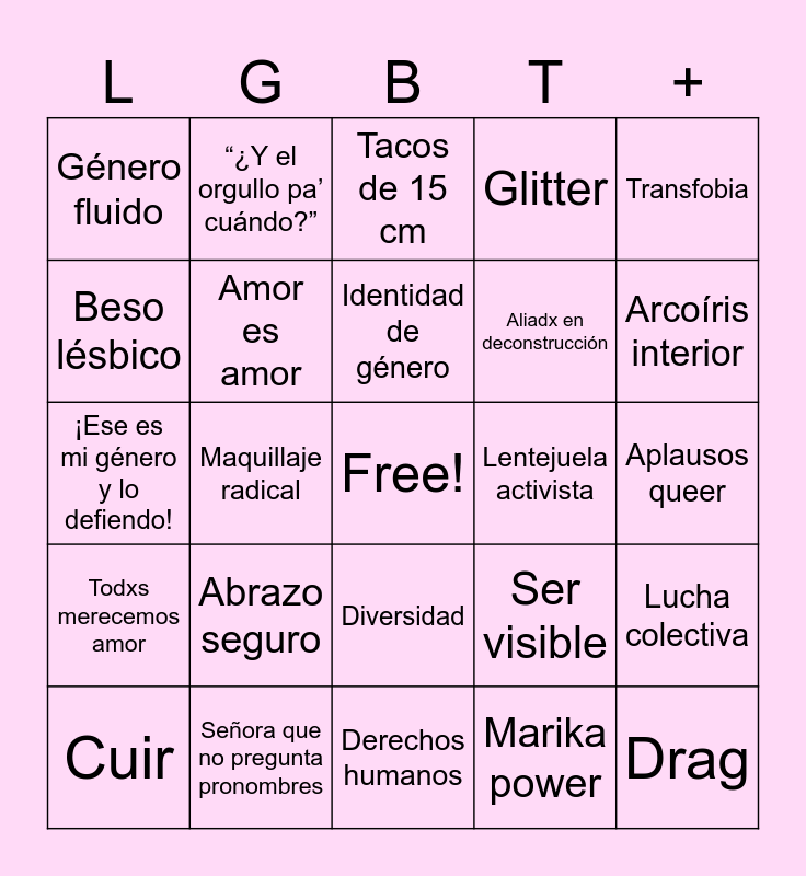 This bingo card has a free space and 35 words: Orgullo, Salida del clóset, Familia elegida, Amor es amor, Diversidad, Glitter, Beso lésbico, No binarie, Identidad de género, Cisheteronorma, ¡Ese es mi género y lo defiendo!, Transfobia, Bifobia, Pansexual, Género fluido, Lentejuela activista, Marika power, Maquillaje radical, Todxs merecemos amor, Drag, Ser visible, Cuir, Lucha colectiva, Señora que no pregunta pronombres, Tacos de 15 cm, Arcoíris interior, Consentimiento, Marcha del orgullo, Aliadx en deconstrucción, Aplausos queer, El closet ya no me queda, Derechos humanos, Abrazo seguro, “¿Y el orgullo pa’ cuándo?” and LGBTIQ+ y con Wi-Fi.