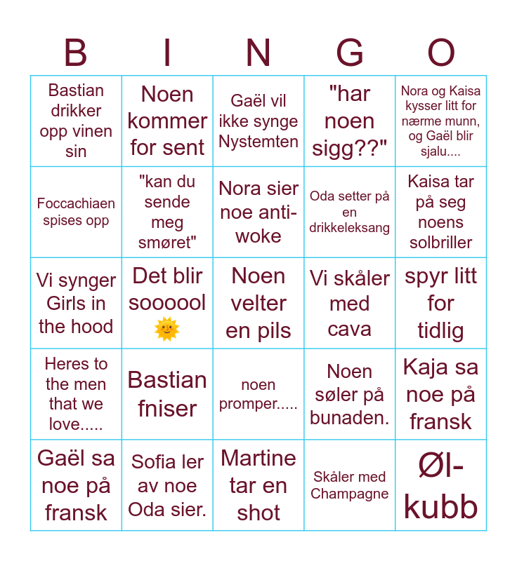 This bingo card has a free space and 24 words: Bastian fniser, Sofia ler av noe Oda sier., Nora sier noe anti-woke, Gaël sa noe på fransk, Nora og Kaisa kysser litt for nærme munn, og Gaël blir sjalu...., Bastian drikker opp vinen sin, Foccachiaen spises opp, Noen kommer for sent, Vi skåler med cava, noen promper....., Oda setter på en drikkeleksang, Vi synger Girls in the hood, Noen søler på bunaden., Kaja sa noe på fransk, "kan du sende meg smøret", Skåler med Champagne, spyr litt for tidlig, Gaël vil ikke synge Nystemten, Kaisa tar på seg noens solbriller, Det blir soooool🌞, Øl-kubb, Heres to the men that we love....., "har noen sigg??" and Martine tar en shot.