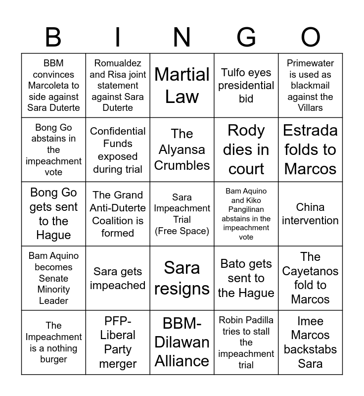 This bingo card has a free space and 24 words: Sara gets impeached, PFP-Liberal Party merger, The Alyansa Crumbles, The Impeachment is a nothing burger, Primewater is used as blackmail against the Villars, BBM convinces Marcoleta to side against Sara Duterte, Bong Go abstains in the impeachment vote, Romualdez and Risa joint statement against Sara Duterte, Bam Aquino and Kiko Pangilinan abstains in the impeachment vote, Sara resigns, Rody dies in court, Bong Go gets sent to the Hague, Bato gets sent to the Hague, The Cayetanos fold to Marcos, Confidential Funds exposed during trial, Robin Padilla tries to stall the impeachment trial, China intervention, Martial Law, Estrada folds to Marcos, The Grand Anti-Duterte Coalition is formed, Imee Marcos backstabs Sara, Bam Aquino becomes Senate Minority Leader, Tulfo eyes presidential bid and BBM-Dilawan Alliance.