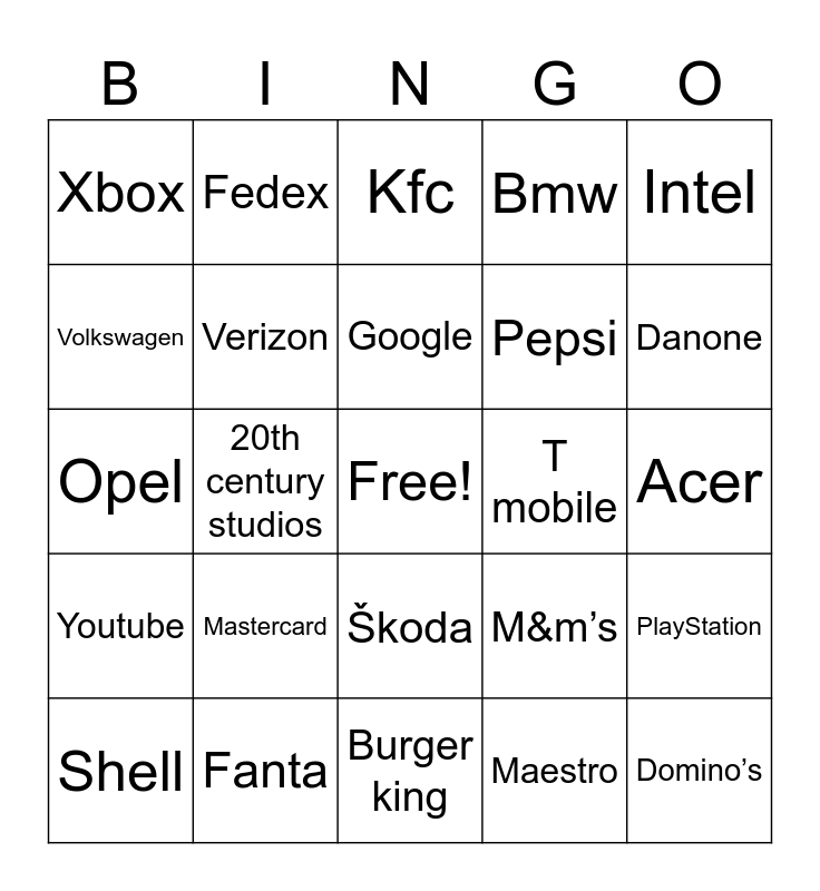 This bingo card has a free space and 60 words: Coca-Cola, Mastercard, Nissan, Lg, Acer, Hp, Verizon, Panasonic, T mobile, Paramount pictures, Volkswagen, McDonald’s, Pepsi, Mountain dew, Target, Fedex, Google, Bmw, Toyota, Opel, 20th century studios, Kfc, Big idea, Danone, Doritos, Audi, Škoda, Mazda, Intel, Renault, Citroën, Samsung, Datsun, Microsoft, Xbox, Apple, Yahoo!, M&m’s, Subway, Youtube, Hbo, Burger king, Maestro, Cirrus, Mondex, At&t, Nickelodeon, Ntt, Bp, Shell, Fanta, Sprite, Coca - cola zero, Domino’s, Barney, Cinar, Taco bell, Motorola, PlayStation and Ford.