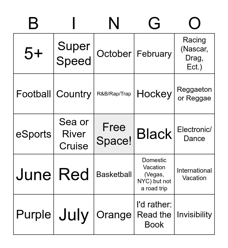 This bingo card has a free space and 79 words: Rock, Pet Dog, October, Road Trip or Camping, December, Teleportation, Blue, NO PETS, Levitation/Flight, Soccer, Spring, May, February, 5+, 2, Football, 3, Red, 4, Electronic/ Dance, Baseball, Racing (Nascar, Drag, Ect.), eSports, R&B/Rap/Trap, Country, Rock (Punk, Metal, Alt), Jazz/Blues/Soul, Pop, Classical, Folk, Ska, A Capella, Reggaeton or Reggae, Yellow, Orange, Green, Purple, Black, Pink, Turquoise, Brown, Gray, White, or Iridescence (Rainbow Effect), Invisibility, Super-Strength or Invulnerability, Elemental Power (fire/ice/ect...), Shapeshifting, Telekinesis and/or Telepathy, Healing Powers, Super Speed, Summoning or Magical Ability as superpower, Weather Manipulation or Geomancy, Technopathy or Super-mind, Staycation or Visit Family/Friends Time (Reunions, Ect.), International Vacation, Sea or River Cruise, Domestic Vacation (Vegas, NYC) but not a road trip, Pet Cat, Pet Bird, Pet Reptile, Pet Insect, Amphibious/ Aquatic Pet (Corals, Crabs, Fish, Frog, Turtle, Snails), Tennis, Basketball, Hockey, Swimming or Gymnastics, Gold, Silver, or Metallic (Bronze, Platinum, Ect.), 1, Summer, Winter, Fall, January, April, June, July, August, September, November, I'd rather: Watch the Movie, I'd rather: Read the Book, I'd rather: Read the book THEN watch the movie, Shared my dream! and Shared my favorite thing!.