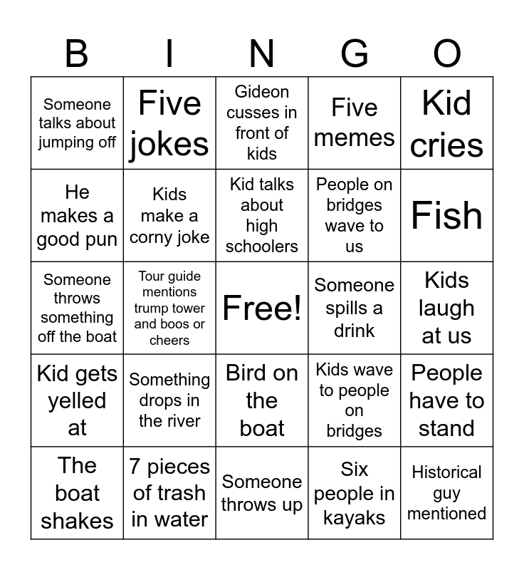 This bingo card has a free space and 25 words: Something drops in the river, Someone throws up, Kid talks about high schoolers, The boat shakes, Kid cries, Someone talks about jumping off, He makes a good pun, Five jokes, Someone spills a drink, Bird on the boat, People on bridges wave to us, Someone throws something off the boat, Kids wave to people on bridges, People have to stand, Kids make a corny joke, Kid cusses, Kids laugh at us, Gideon cusses in front of kids, Fish, Tour guide mentions trump tower and boos or cheers, Historical guy mentioned, 7 pieces of trash in water, Kid gets yelled at, Five memes and Six people in kayaks.