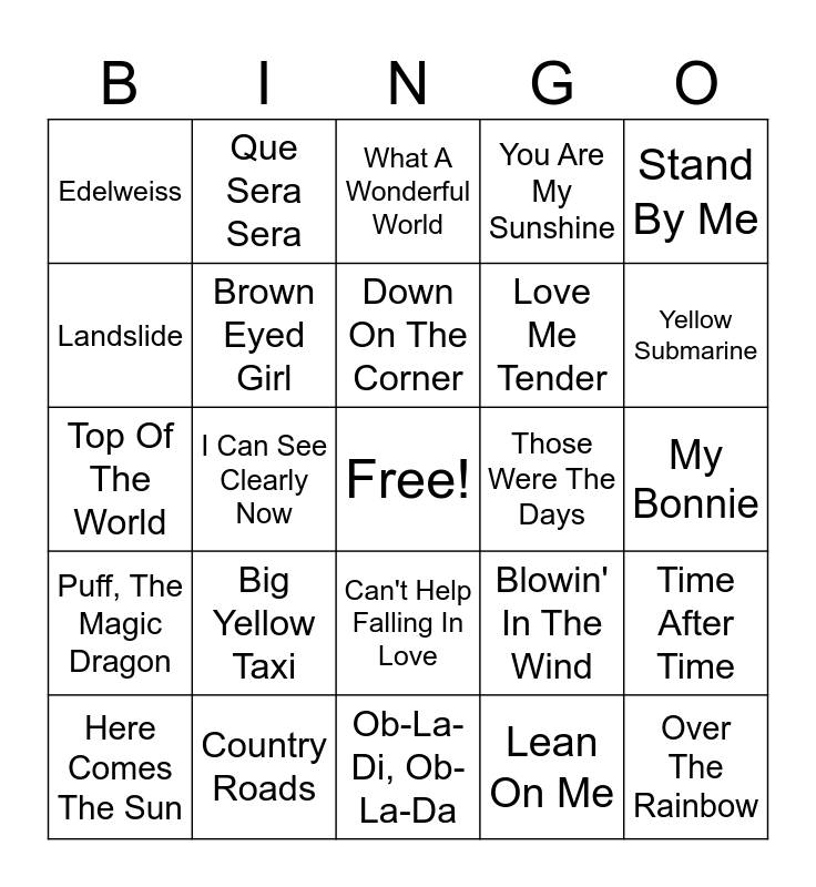 This bingo card has a free space and 24 words: Big Yellow Taxi, Country Roads, Down On The Corner, Here Comes The Sun, Stand By Me, Edelweiss, Landslide, Que Sera Sera, Those Were The Days, Can't Help Falling In Love, Love Me Tender, Top Of The World, Blowin' In The Wind, Time After Time, Brown Eyed Girl, Lean On Me, My Bonnie, What A Wonderful World, Yellow Submarine, I Can See Clearly Now, Over The Rainbow, Puff, The Magic Dragon, You Are My Sunshine and Ob-La-Di, Ob-La-Da.