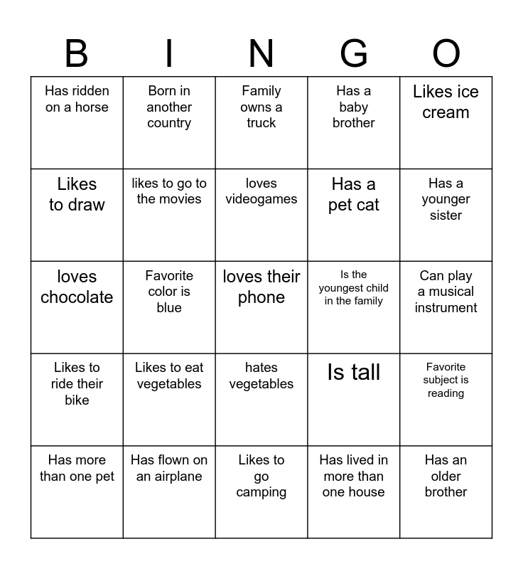 This bingo card has a free space and 24 words: Likes to eat vegetables, Has flown on an airplane, loves videogames, Has more than one pet, Likes ice cream, Has ridden on a horse, Likes to draw, Born in another country, Is the youngest child in the family, hates vegetables, Has a pet cat, loves chocolate, Is tall, Favorite subject is reading, likes to go to the movies, Has lived in more than one house, Can play a musical instrument, Family owns a truck, Has a younger sister, Favorite color is blue, Has an older brother, Likes to ride their bike, Has a baby brother and Likes to go camping.