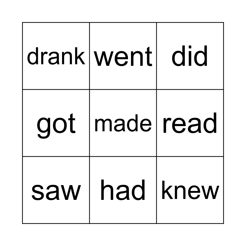 This bingo card has 18 words: bought, came, did, drank, ate, got, gave, went, had, knew, left, made, met, read, saw, slept, took and wrote.