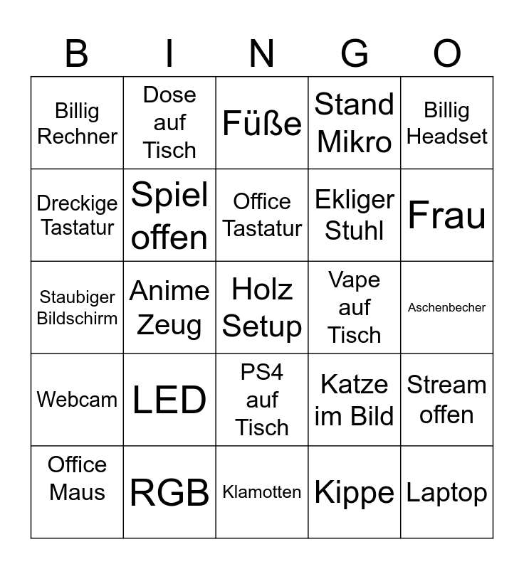 This bingo card has a free space and 24 words: LED, RGB, Office Tastatur, Office Maus, Billig Headset, Billig Rechner, Dreckige Tastatur, Dose auf Tisch, Vape auf Tisch, PS4 auf Tisch, Ekliger Stuhl, Staubiger Bildschirm, Katze im Bild, Stream offen, Spiel offen, Kippe, Aschenbecher, Füße, Frau, Anime Zeug, Laptop, Webcam, Stand Mikro and Klamotten.