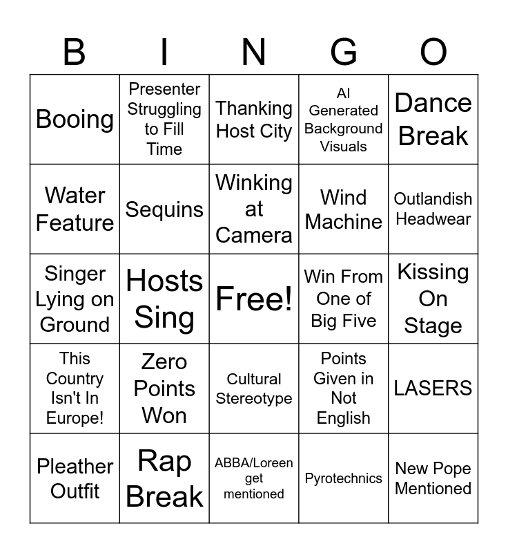 This bingo card has a free space and 34 words: Mid-Song Outfit Change, Pyrotechnics, Awkward Time Delay, Obviously Fake Instrument Playing, This Country Isn't In Europe!, Sequins, Dance Break, Pleather Outfit, Presenter Struggling to Fill Time, Song About Love, Winking at Camera, Thanking Host City, Smuggled In Non-Approved Flag, Glitter Cannon, Win From One of Big Five, Outlandish Headwear, Rap Break, Singer Lying on Ground, Zero Points Won, Points Given in Not English, Cultural Stereotype, Fetish Clothing, Booing, Kissing On Stage, ABBA/Loreen get mentioned, New Pope Mentioned, AI Generated Background Visuals, Vehicle On Stage, Wind Machine, Water Feature, Traditional Instrument Used, Hosts Sing, LASERS and Singer Lifted By Dancers.