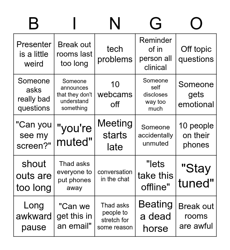 This bingo card has a free space and 24 words: Thad asks everyone to put phones away, "Can we get this in an email", 10 webcams off, Long awkward pause, Off topic questions, Presenter is a little weird, Someone asks really bad questions, Break out rooms last too long, Someone accidentally unmuted, conversation in the chat, Someone self discloses way too much, "Can you see my screen?", "lets take this offline", "Stay tuned", Someone announces that they don't understand something, Beating a dead horse, 10 people on their phones, tech problems, Someone gets emotional, "you're muted", Break out rooms are awful, shout outs are too long, Reminder of in person all clinical and Thad asks people to stretch for some reason.