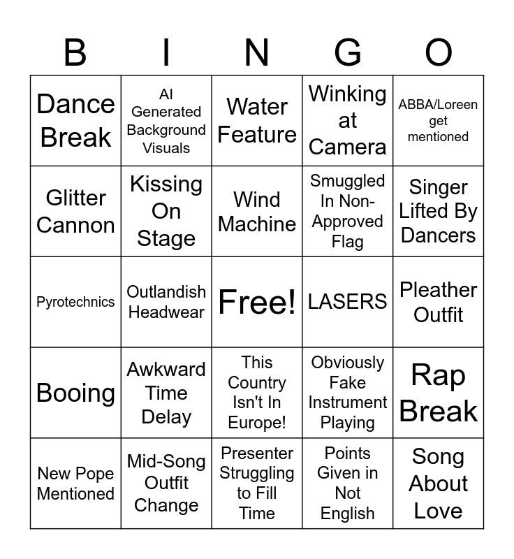 This bingo card has a free space and 34 words: Zero Points Won, Points Given in Not English, Cultural Stereotype, Fetish Clothing, Booing, Kissing On Stage, ABBA/Loreen get mentioned, New Pope Mentioned, AI Generated Background Visuals, Vehicle On Stage, Wind Machine, Water Feature, Traditional Instrument Used, Hosts Sing, LASERS, Singer Lifted By Dancers, Mid-Song Outfit Change, Pyrotechnics, Awkward Time Delay, Obviously Fake Instrument Playing, This Country Isn't In Europe!, Sequins, Dance Break, Pleather Outfit, Presenter Struggling to Fill Time, Song About Love, Winking at Camera, Thanking Host City, Smuggled In Non-Approved Flag, Glitter Cannon, Win From One of Big Five, Outlandish Headwear, Rap Break and Singer Lying on Ground.