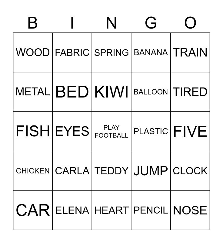 This bingo card has a free space and 24 words: CARLA, ELENA, KIWI, CAR, TRAIN, WOOD, METAL, FABRIC, PLASTIC, TEDDY, BALLOON, FISH, JUMP, CLOCK, BED, PENCIL, FIVE, SPRING, TIRED, EYES, NOSE, CHICKEN, BANANA and HEART.