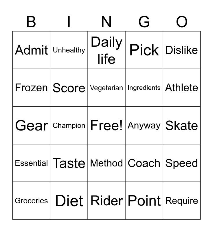 This bingo card has a free space and 24 words: Taste, Diet, Vegetarian, Groceries, Dislike, Admit, Frozen, Unhealthy, Anyway, Method, Ingredients, Gear, Coach, Speed, Score, Point, Skate, Daily life, Athlete, Champion, Require, Essential, Pick and Rider.