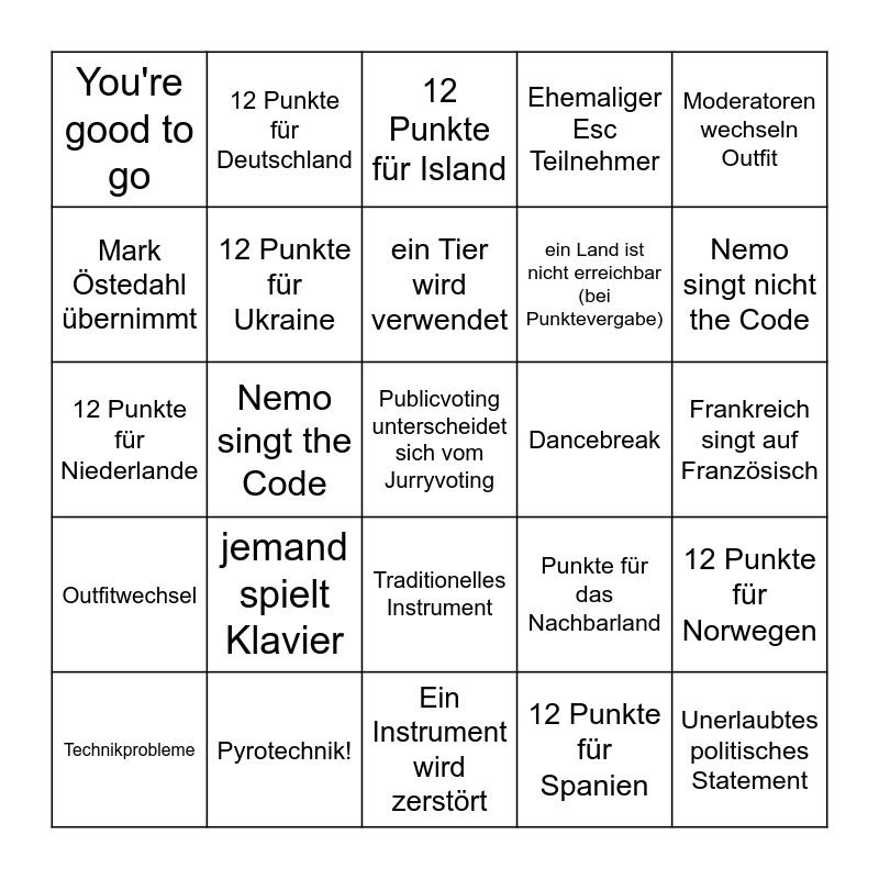 This bingo card has a free space and 54 words: Nemo wird erwähnt, Outfitwechsel, Pride Flag, Keine Deutsche Fahne bei Parade, Traditionelles Instrument, Ja ja Ding Dong, Ehemaliger Esc Teilnehmer, Windmaschine, Mark Östedahl übernimmt, Schweden bekommt 12 Punkte, You're good to go, Land bekommt 0 Punkte, Pyrotechnik!, Technikprobleme, Alltagsgegenstände werden verwendet, Ein Instrument wird zerstört, Unerlaubtes politisches Statement, ein Land ist nicht erreichbar (bei Punktevergabe), alter ESC Teilnehmer vergibt Punkte, Frankreich singt auf Französisch, Punkte für das Nachbarland, Backrounssänger, Dancebreak, Moderatoren wechseln Outfit, 12 Punkte für Schweden, 12 Punkte für Deutschland, 12 Punkte für Schweiz, 12 Punkte für Israel, 12 Punkte für Polen, 12 Punkte für Spanien, 12 Punkte für Frankreich, 12 Punkte für UK, 12 Punkte für Albanien, 12 Punkte für Estland, 12 Punkte für Island, 12 Punkte für Italien, 12 Punkte für Niederlande, 12 Punkte für Norwegen, 12 Punkte für Portugal, 12 Punkte für Ukraine, Komentator sagt etwas totes, Celin Dion, Moderatoren haben Outfits passend zur Flagge, singen in Landessprache, jemand spielt Klavier, Irgendwas schwebt, Stroposkoplicht, Masken, ein Tier wird verwendet, Nemo singt the Code, Nemo singt nicht the Code, Schweizer Kultur, Douze Points and Goldregen.